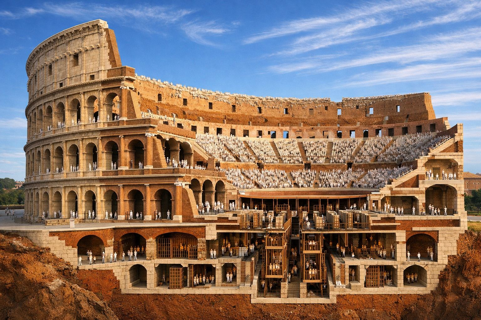 L'elemento più affascinante e meno conosciuto del Colosseo è il suo sistema sotterraneo, l'ipogeo: un labirinto di corridoi, stanze, pozzi e montacarichi che occupava l'intera superficie sotto il pavimento dell'arena. L'ipogeo fu costruito dall'imperatore Domiziano dopo l'inaugurazione del padre Tito, sostituendo l'originale arena di sabbia con una struttura permanente in mattoni e legno che permetteva la gestione dei gladiatori, degli animali e delle scenografie in modo nascosto al pubblico.