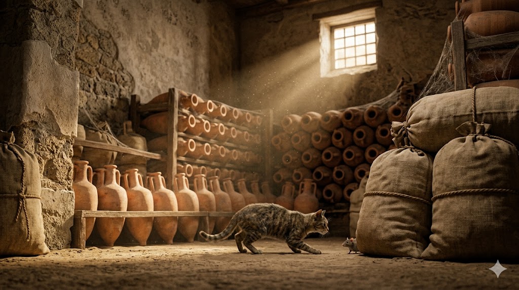 La funzione primaria e più apprezzata del gatto nel mondo romano era quella di controllore dei roditori, e nessun contesto era più strategico per esercitare questa funzione dei grandi magazzini granari dell'impero. I granai pubblici, noti come horrea, erano strutture fondamentali per il funzionamento dell'intera macchina statale romana: in essi venivano immagazzinate le enormi quantità di grano necessarie per sfamare la plebe di Roma attraverso le distribuzioni annuariali garantite dall'annona, il sistema pubblico di approvvigionamento alimentare. Topi e ratti erano una minaccia concreta e costante per queste riserve: capaci di consumare quantità enormi di cereali, di contaminare i sacchi con le loro deiezioni e di trasmettere malattie attraverso i morsi, i roditori potevano compromettere in poche settimane scorte alimentari accumulate con mesi di fatica e di spesa. I gatti erano quindi accolti e incoraggiati negli horrea come lavoratori naturali e insostituibili, capaci di pattugliare i depositi con efficienza notturna e di ridurre drasticamente le perdite causate dai roditori. Lo stesso sistema di controllo biologico veniva applicato nei porti commerciali, dove i grandi magazzini affacciati sui moli ospitavano merci di ogni tipo vulnerabili all'attacco dei topi, e nelle tabernae frumentariae, le botteghe che rivendevano cereali e farine al dettaglio nella quotidiana vita commerciale delle città romane.