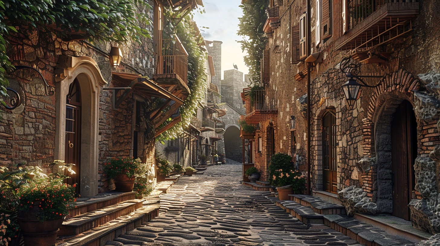 Vicolo medievale del quartiere San Pellegrino a Viterbo con logge e profferli
