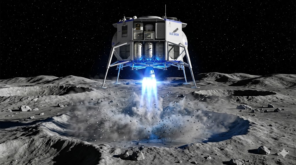 Rendering del lander Blue Moon di Blue Origin in fase di discesa sulla superficie lunare