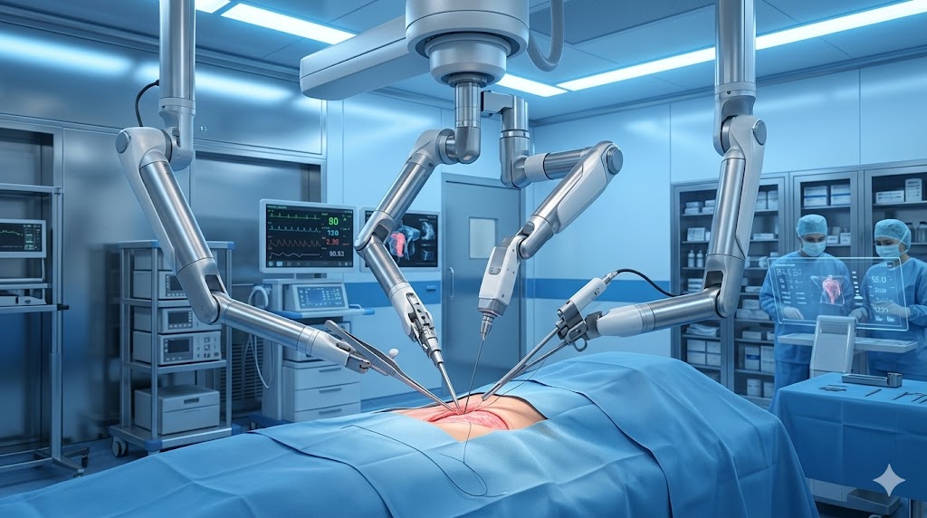 Robot chirurgico autonomo di nuova generazione in sala operatoria futuristica