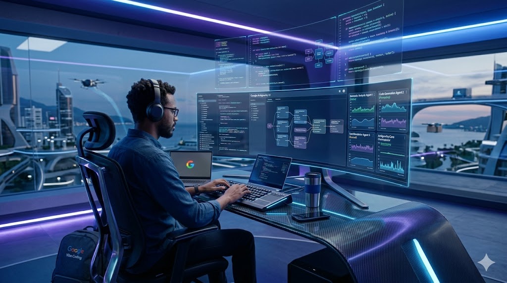 Sviluppatore che supervisiona agenti IA su schermi multipli con interfaccia Google Antigravity