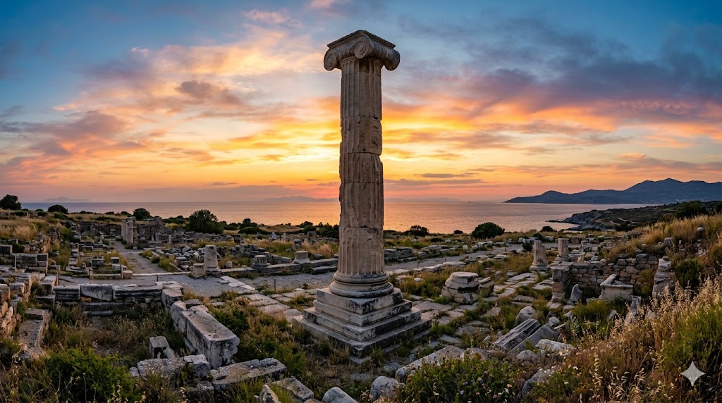Rovine monumentali dell'Heraion di Samo con un'unica colonna superstite contro il cielo