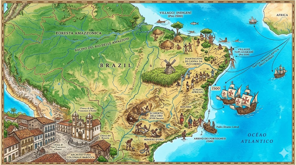 Mappa storica del Brasile con elementi indigeni e coloniali portoghesi