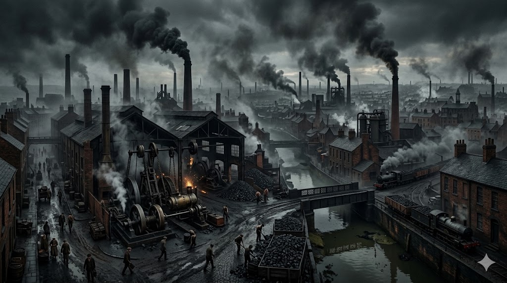 Un paesaggio urbano fumoso e affollato agli albori della Rivoluzione Industriale