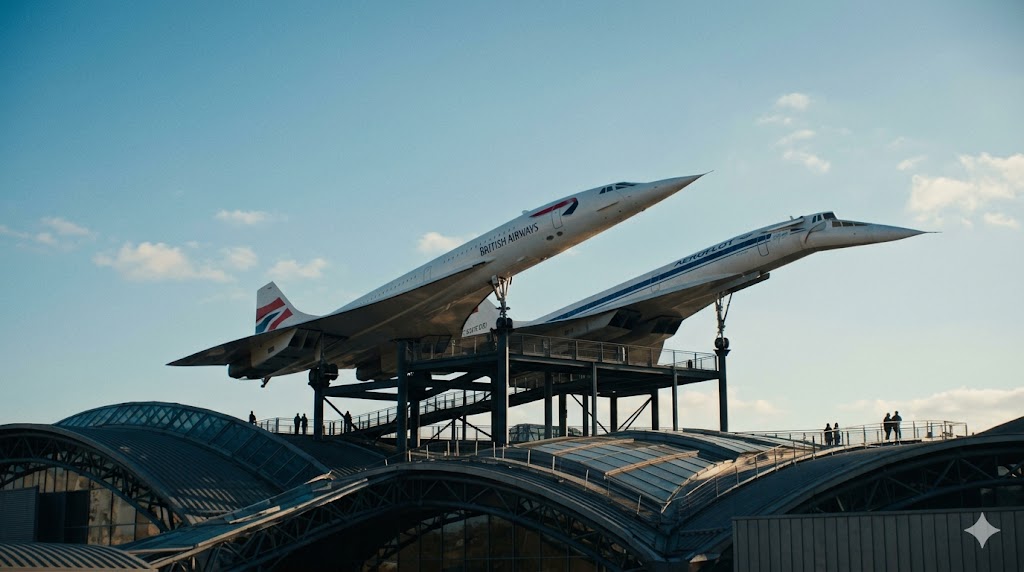 Aerei supersonici Concorde Tupolev esposti tetto museo tecnologia