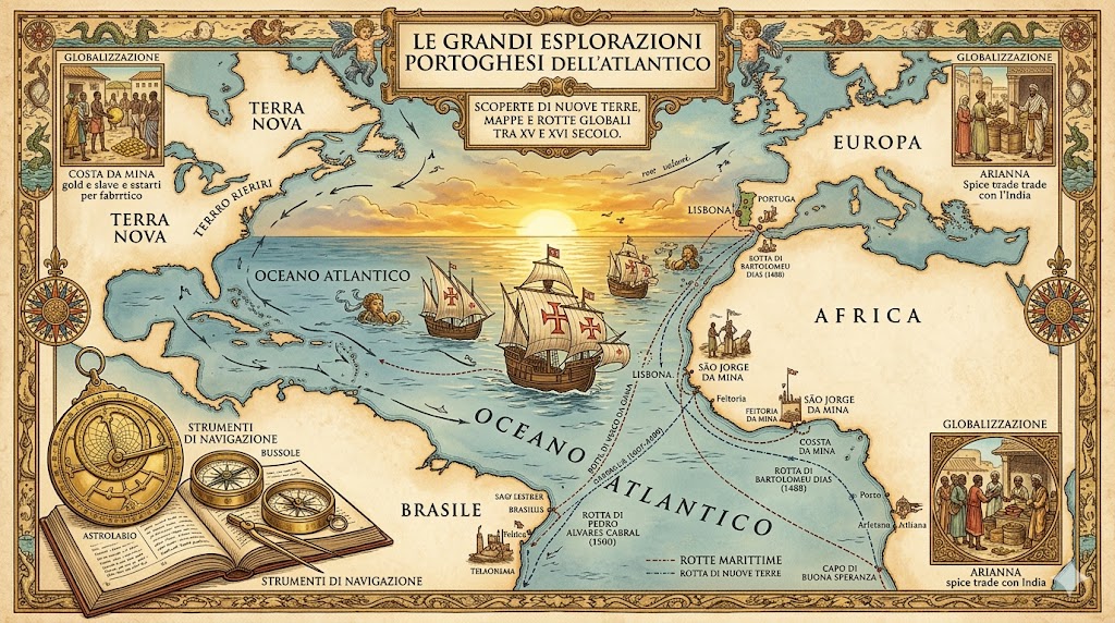 La caduta di Costantinopoli nel millequattrocentocinquantatré aveva reso le rotte terrestri verso l'Asia pericolose e costose, spingendo le monarchie atlantiche a cercare vie alternative per il commercio di spezie e metalli preziosi. Il Portogallo, sotto la guida di Enrico il Navigatore, fu il pioniere di questa epopea, investendo in innovazioni come la caravella, un'imbarcazione agile capace di navigare controvento, e il perfezionamento dell'astrolabio per il calcolo della latitudine. I marinai portoghesi esplorarono sistematicamente le coste africane fino a quando, nel millequattrocentottantasette, Bartolomeo Diaz doppiò il Capo di Buona Speranza. Undici anni dopo, Vasco da Gama raggiunse l'India, stabilendo il primo collegamento marittimo diretto tra Europa e Oriente. Parallelamente, la Spagna finanziò l'audace progetto di Cristoforo Colombo che, basandosi sull'idea della sfericità della Terra, intendeva raggiungere le Indie navigando verso ovest. L'approdo nelle Bahamas il dodici ottobre millequattrocentonovantadue, pur non portando Colombo in Asia, svelò all'Europa l'esistenza di un intero continente. Solo i viaggi di Amerigo Vespucci all'inizio del sedicesimo secolo chiarirono definitivamente che si trattava di un Nuovo Mondo. Queste spedizioni, completate dalla circumnavigazione del globo di Ferdinando Magellano, distrussero la visione del mondo chiuso del Medioevo e inaugurarono un'era di espansione territoriale senza precedenti, fondata sul dominio dei mari e sulla mappatura scientifica di territori ignoti.