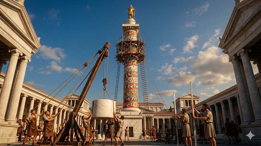 Nel 113 dopo Cristo, quando l'imperatore Marco Ulpio Traiano inaugurò ufficialmente la colonna che porta il suo nome nel cuore del nuovo foro imperiale da lui voluto a Roma, il mondo antico si trovò davanti a qualcosa che non aveva mai visto prima. Non si trattava semplicemente di un monumento commemorativo elevato al cielo: era la prova materiale, incisa nel marmo bianco delle Apuane, che la mente ingegneristica romana era capace di risolvere problemi di precisione che ancora oggi lasciano attoniti gli ingegneri strutturali e gli storici dell'architettura. La colonna non fu ricavata da un unico blocco monolitico di pietra, come avevano fatto in passato i costruttori egizi con gli obelischi o come aveva fatto Roma stessa con alcune delle sue colonne onorarie minori. Fu invece assemblata accatastando verticalmente diciotto enormi cilindri cavi di marmo lunense — il marmo estratto dalle cave di Carrara, in Toscana — ciascuno del peso approssimativo di quaranta tonnellate metriche. Ma il vero prodigio non era il peso dei blocchi né la difficoltà del loro trasporto da nord verso Roma: era ciò che era stato scolpito all'interno di ciascuno di essi prima ancora che venissero sollevati e messi in opera. Dentro ogni tamburo, gli scalpellini romani avevano già intagliato una sezione della scala a chiocciola che, una volta impilati tutti i diciotto elementi, avrebbe dovuto formare un percorso continuo e praticabile per quasi trenta metri di altezza. Una volta che i blocchi fossero stati sollevati e posizionati, non ci sarebbe stato alcun modo di correggere errori: ogni gradino, ogni pianerottolo, ogni curva della spirale doveva essere stato calcolato e scolpito in anticipo con una precisione che oggi chiameremmo ingegneristica nel senso più moderno e rigoroso del termine.