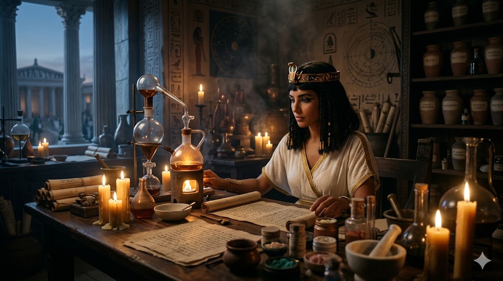 Ricostruzione artistica di Cleopatra VII nel suo laboratorio alchemico ad Alessandria d'Egitto