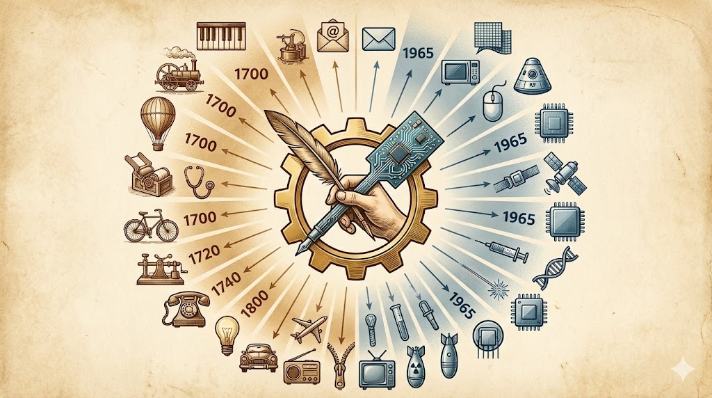 L'analisi trasversale delle trenta invenzioni trattate nei precedenti articoli rivela una struttura temporale chiara nell'evoluzione dei paradigmi tecnologici occidentali. Il XVIII e la prima metà del XIX secolo sono dominati da soluzioni meccaniche e termodinamiche: il pianoforte di Bartolomeo Cristofori (1700), l'acciaio al crogiolo di Benjamin Huntsman (1740), il carro a vapore di Nicolas-Joseph Cugnot (1769) e la mongolfiera dei fratelli Montgolfier (1783) sono tutti interventi volti a potenziare la forza fisica umana e a superare i limiti naturali attraverso l'ingegneria meccanica e il calore.