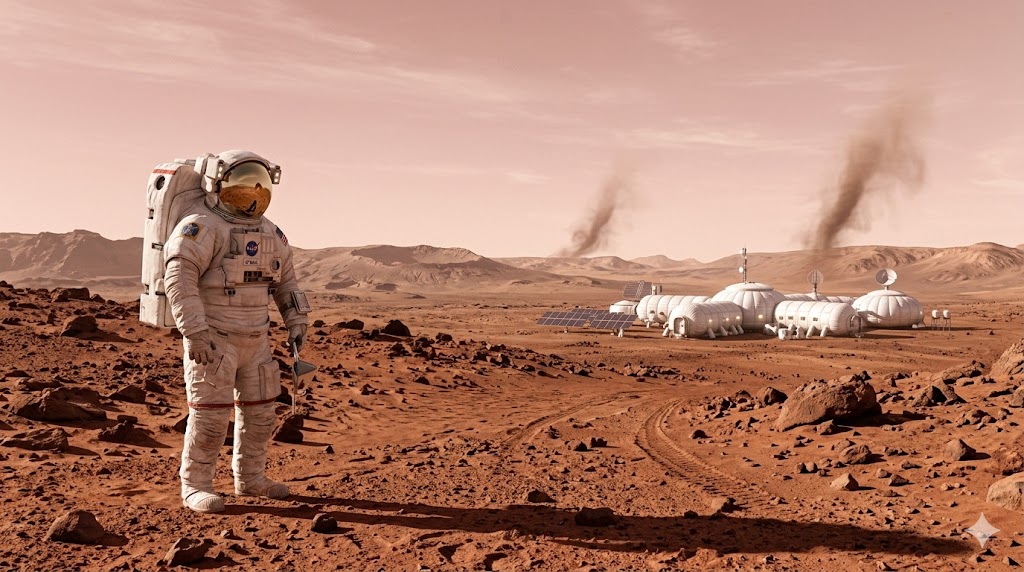Astronauta in tuta spaziale su paesaggio marziano color ruggine con habitat modulare