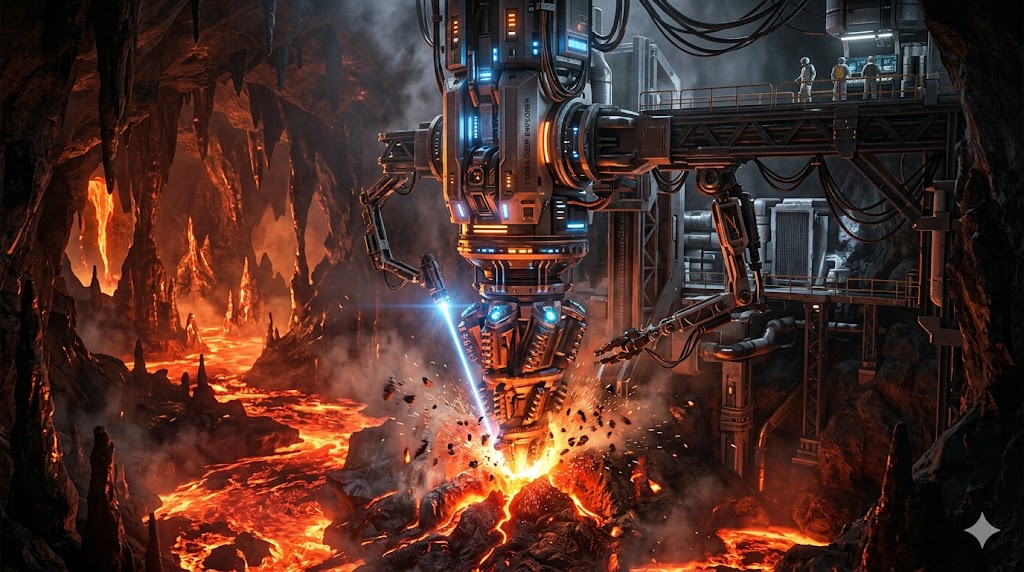 Rappresentazione concettuale di una trivella ad alta tecnologia che penetra gli strati incandescenti della crosta terrestre profonda