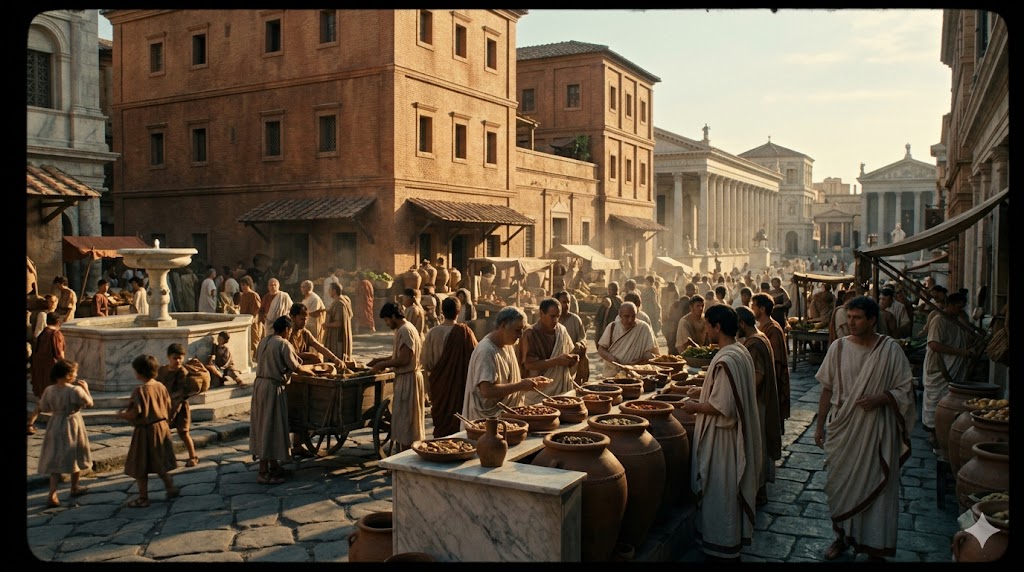 Scena di vita quotidiana nell'antica Roma con mercato affollato e insulae