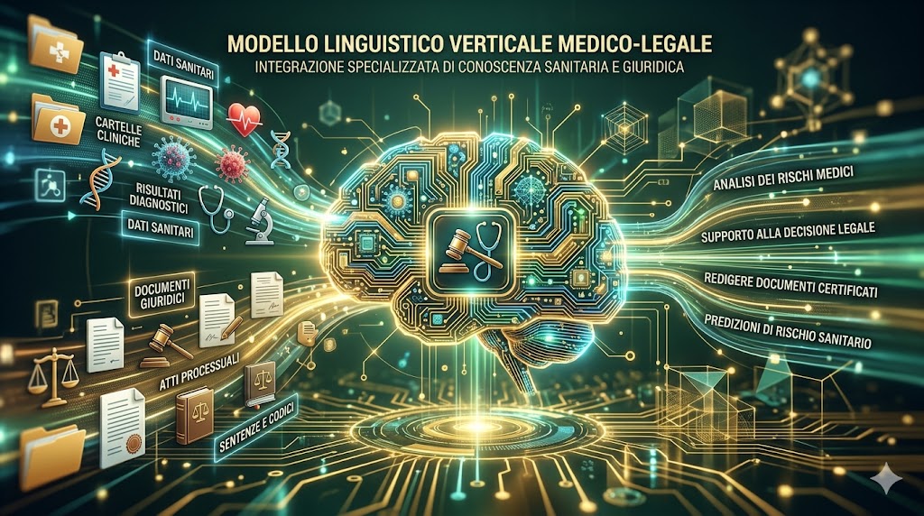 Rappresentazione grafica di un modello linguistico verticale specializzato in ambito medico-legale, con icone di dati sanitari e documenti giuridici che fluiscono in un cervello digitale