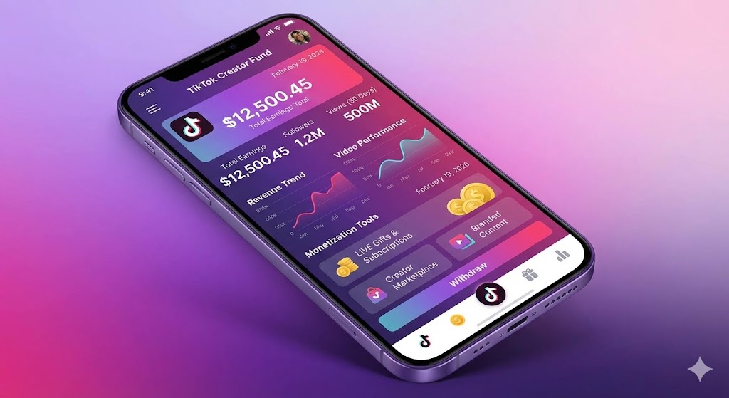 Dashboard TikTok Creator Fund analytics monetizzazione visualizzazioni follower earnings interfaccia mobile 2026