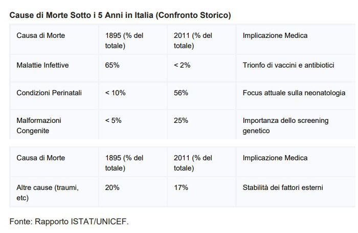 Il XX secolo ha visto uno dei cambiamenti più profondi nella storia della salute umana: il progressivo declino delle malattie infettive come principale causa di morte. Vaccini, antibiotici, miglioramento delle condizioni igienico-sanitarie e accesso all'acqua potabile hanno ridotto drasticamente la mortalità per patologie che per secoli avevano decimato le popolazioni. Se nel 1895 oltre il 65 percento dei decessi infantili era attribuibile a malattie infettive, oggi queste rappresentano una frazione minima, sostituite da condizioni perinatali e malformazioni congenite. La mortalità per HIV in Italia, ad esempio, è crollata da 8,5 per 100.000 abitanti nel 1995 a 0,66 nel 2019.