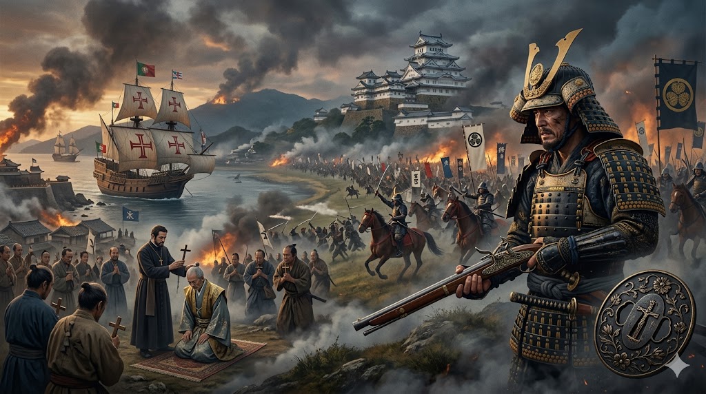 Il Giappone del 1500 fu un laboratorio di trasformazioni sociali e tecnologiche senza precedenti, in cui l'archibugio e il crocifisso si incrociarono con la katana e il bushido. I tre unificatori forgiarono nel sangue un impero che scelse deliberatamente la via dell'isolamento, sigillando una pace duratura che avrebbe resistito fino all'arrivo delle navi nere del commodoro Perry.
