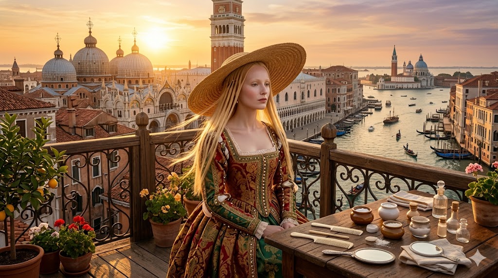 Donna rinascimentale con solana e cerussa veneziana in una scena di toeletta