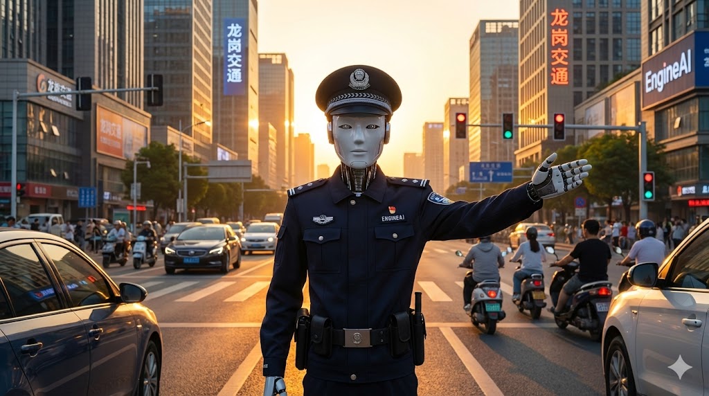 Un robot umanoide in divisa della polizia dirige il traffico a Longgang, Shenzhen.