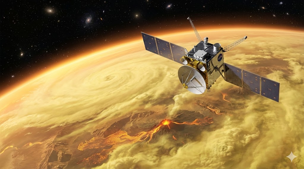 Rendering artistico della sonda VERITAS in orbita attorno a Venere con il pianeta avvolto in nuvole gialle acide sullo sfondo