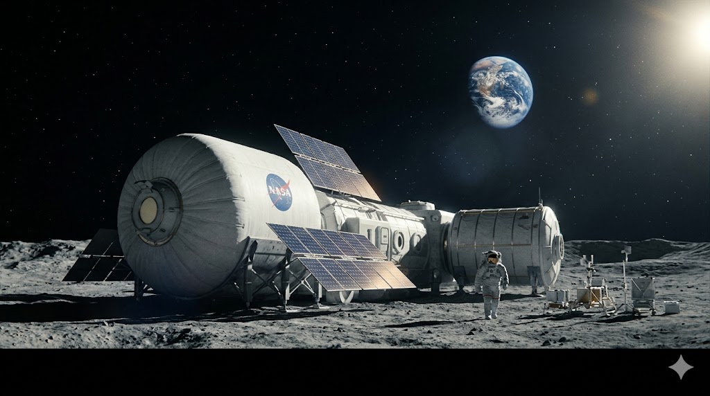 Rendering artistico del Lunar Gateway con il modulo Crew and Science Airlock agganciato in orbita cislunare