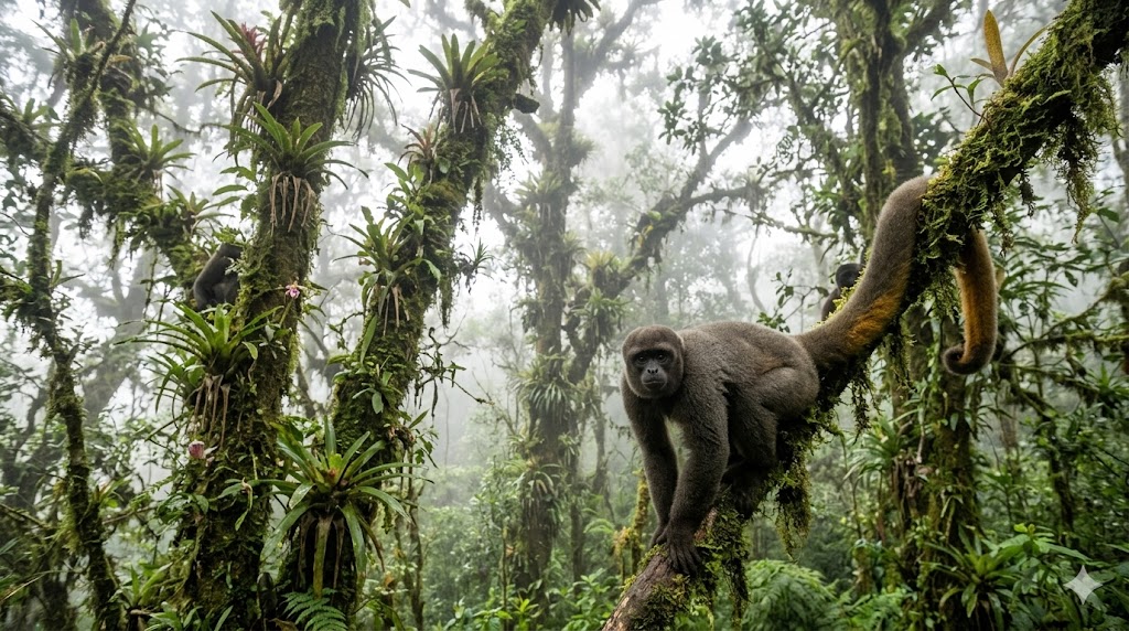 Foresta nebulosa delle Ande peruviane nel Parco Nazionale del Río Abiseo con scimmia lanosa a coda gialla