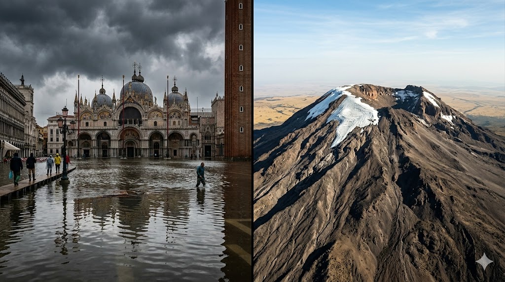 Venezia con acque alte sistema MOSE attivo e ghiacciaio del Kilimanjaro in ritirata