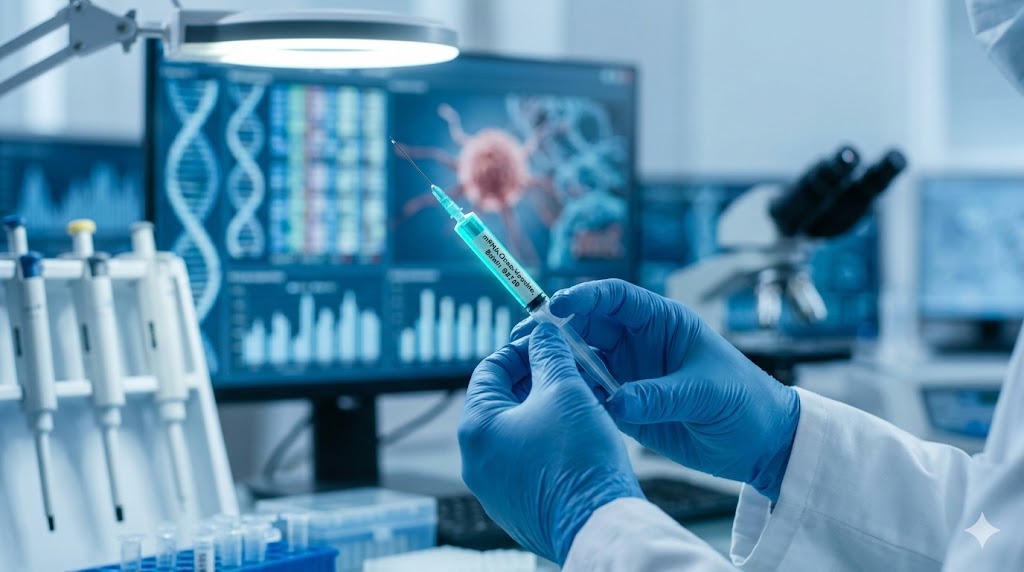 Ricercatrice in laboratorio analizza vaccino mRNA oncologico personalizzato su campioni tumorali