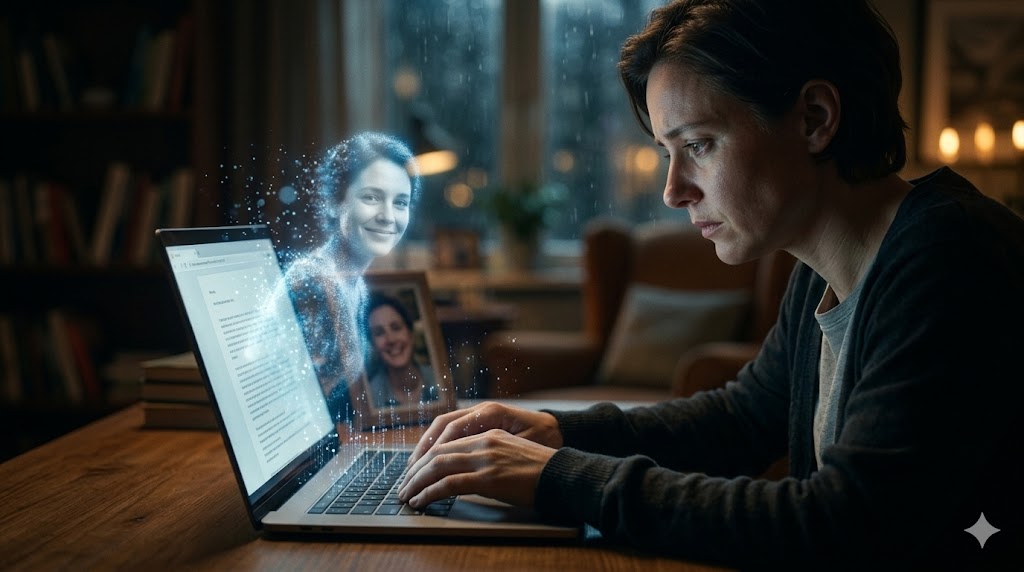 Schermo con avatar digitale che simula una persona scomparsa, luce tenue emotiva