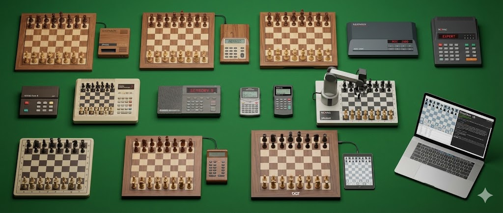 Selezione storica di scacchiere elettroniche degli anni Ottanta: Mephisto, Fidelity, Novag