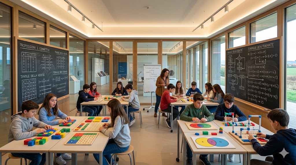 Una classe di studenti impegnata in un laboratorio didattico interattivo sulla logica matematica all'interno del museo.
