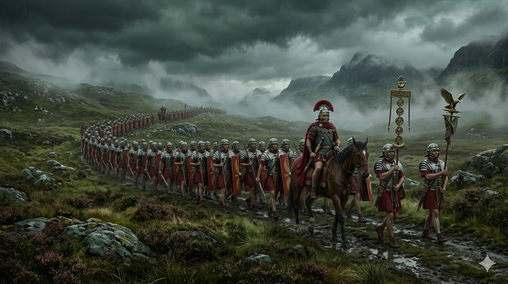 Legionari romani in marcia attraverso le brughiere della Caledonia sotto cieli tempestosi