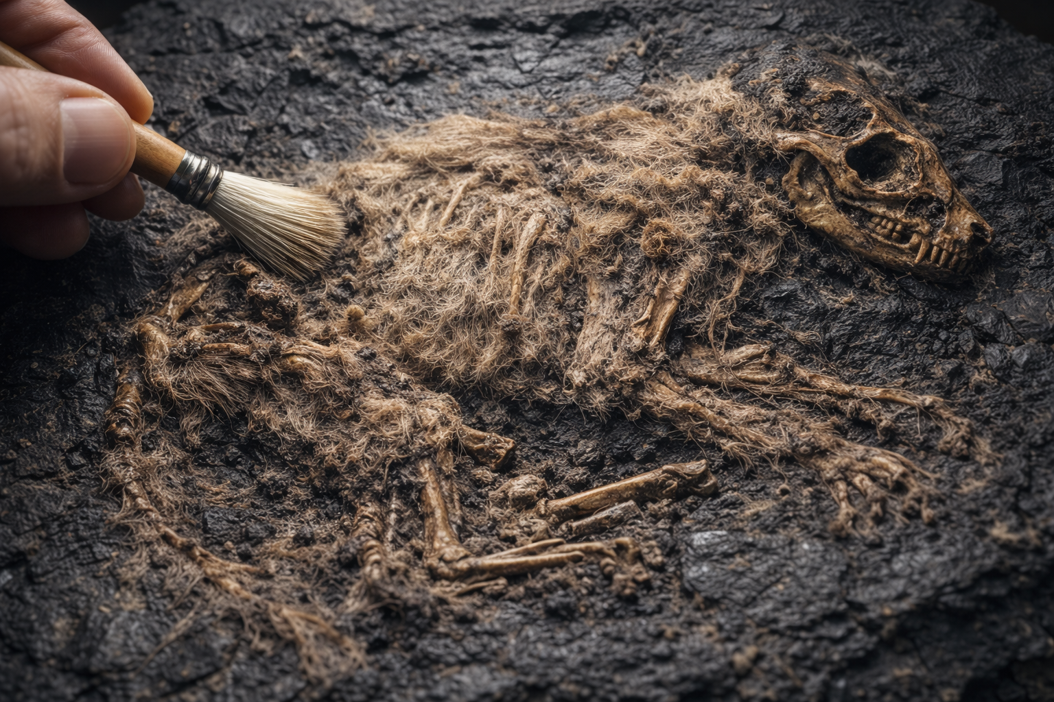 Fossile eccezionalmente preservato di mammifero eocenico di Messel Germania con tracce di pelo e tessuti molli visibili nella roccia scura
