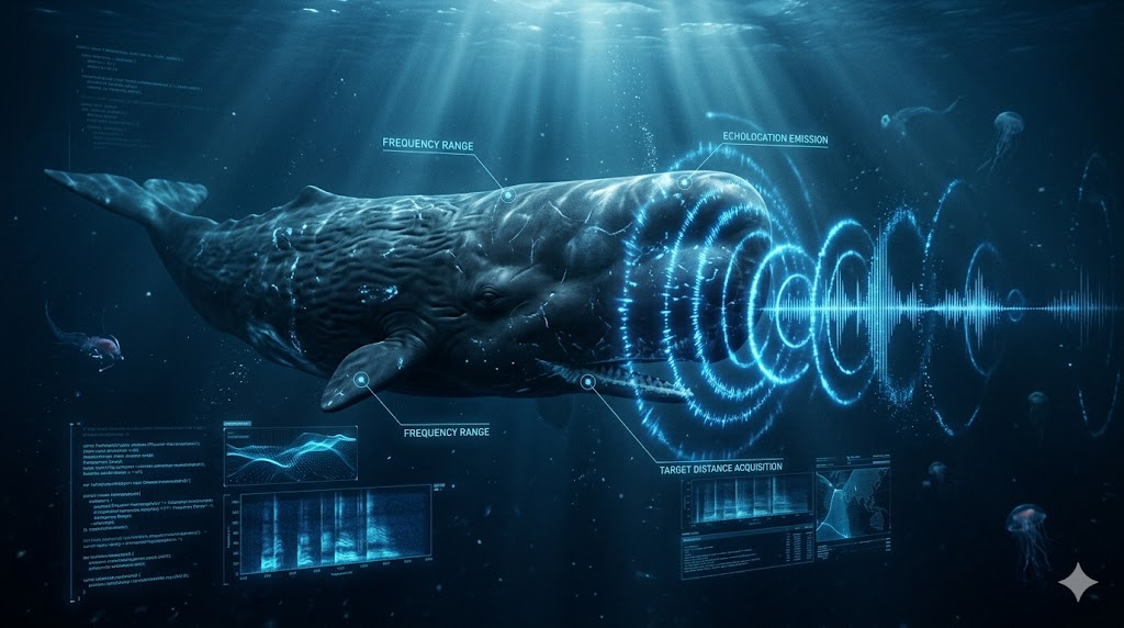 Capodoglio in superficie con onde sonore visualizzate digitalmente