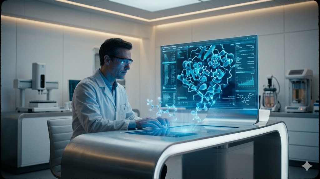 Simulazione computerizzata di molecole farmaceutiche in laboratorio