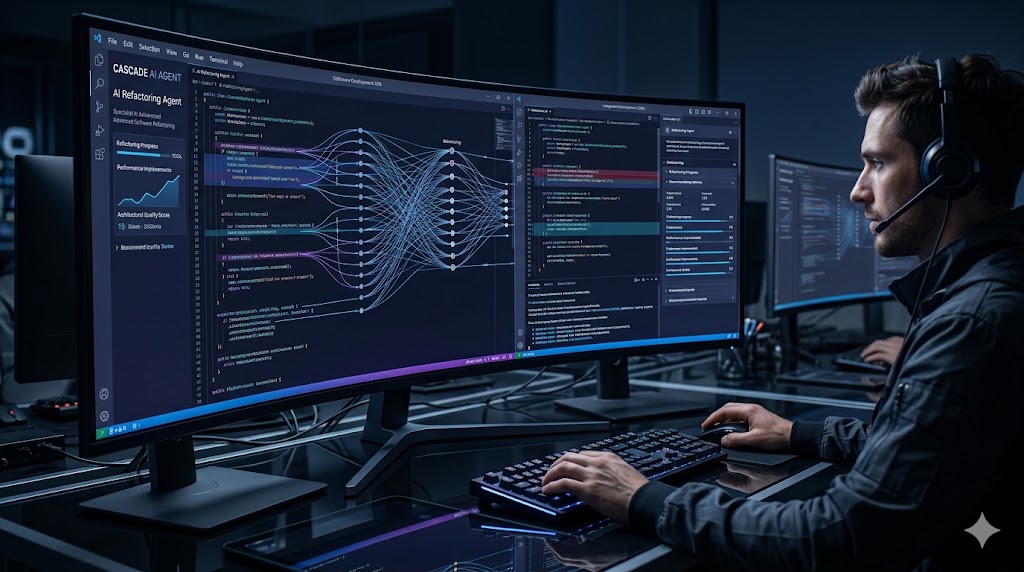 Interfaccia di Windsurf con l'agente Cascade durante un'operazione di refactoring autonomo su codice software.