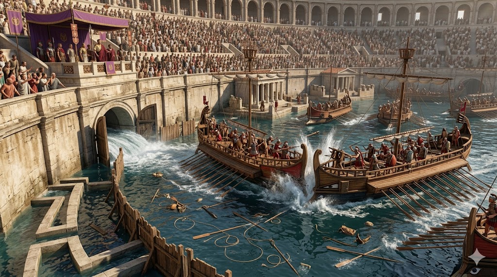 L'imponente arena del Colosseo invasa dall'acqua durante una spettacolare battaglia navale