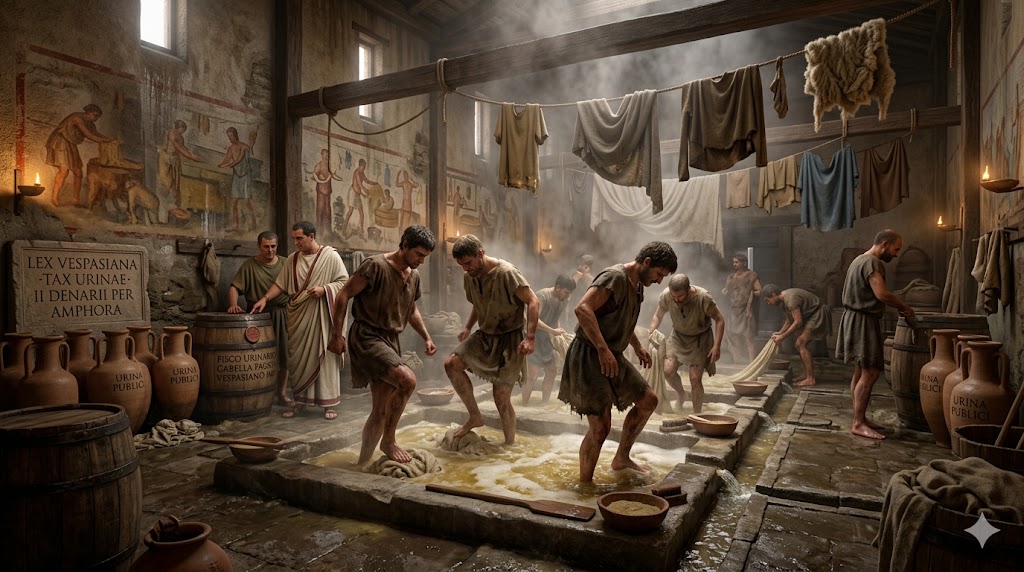 I lavoratori schiavi operano faticosamente nelle vasche della fullonica romana