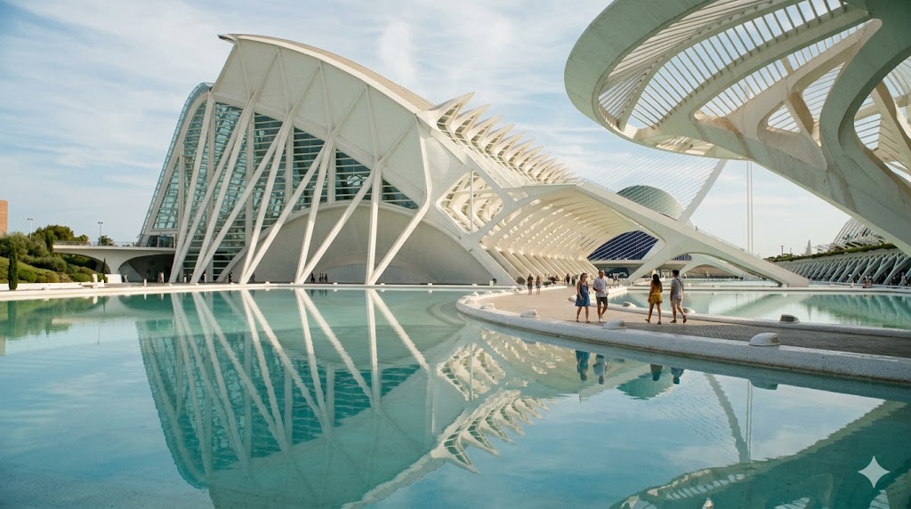 Architettura futuristica bianca Santiago Calatrava riflesso acqua Valencia