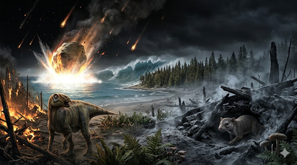 L'impatto di Chicxulub con ejecta incandescenti e tsunami