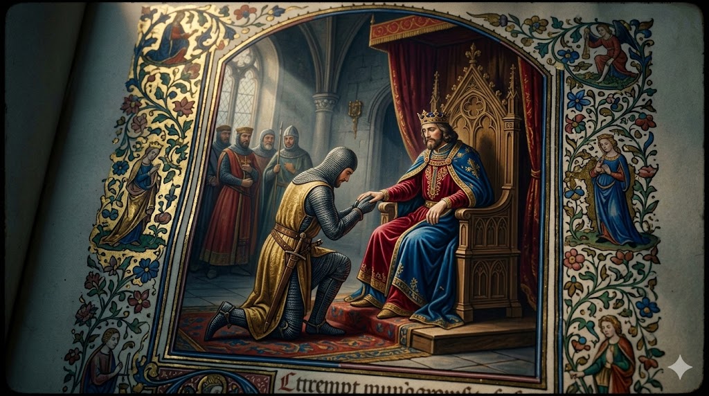 Miniatura medievale raffigurante un giuramento di vassallaggio feudale