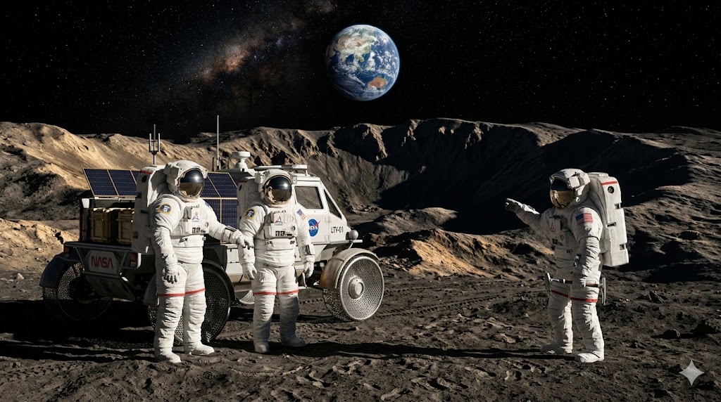 Astronauta NASA con rover lunare al Polo Sud della Luna con la Terra sullo sfondo