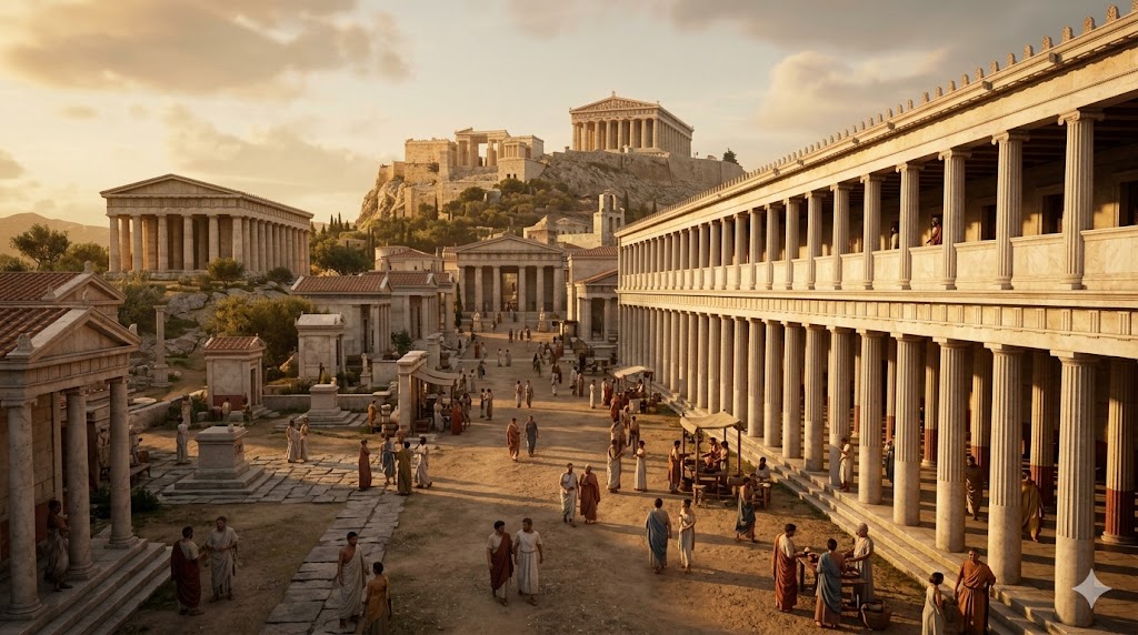 Ricostruzione dell’Agorà di Atene con cittadini greci in abiti tradizionali