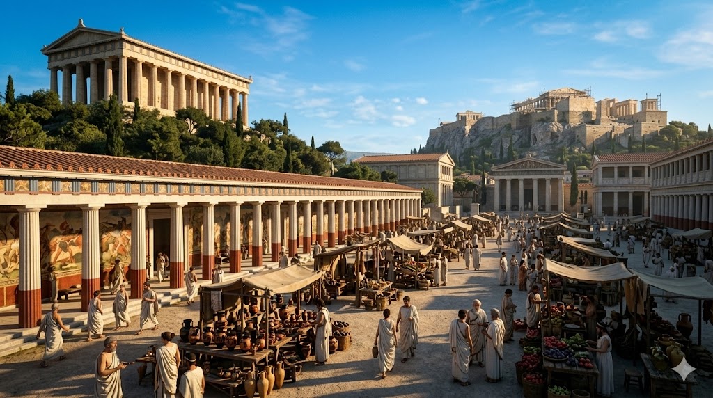 L'agorà di Atene, sviluppatasi a partire dal VII-VI secolo avanti Cristo a nord-ovest dell'Acropoli, divenne nel corso del V secolo avanti Cristo il centro nevralgico della polis più influente del mondo greco. Ogni mattina, i cittadini ateniesi vi si recavano per fare acquisti, partecipare alle assemblee, assistere ai processi pubblici, incontrarsi con filosofi e politici. Era, in tutti i sensi, la piazza del mondo.