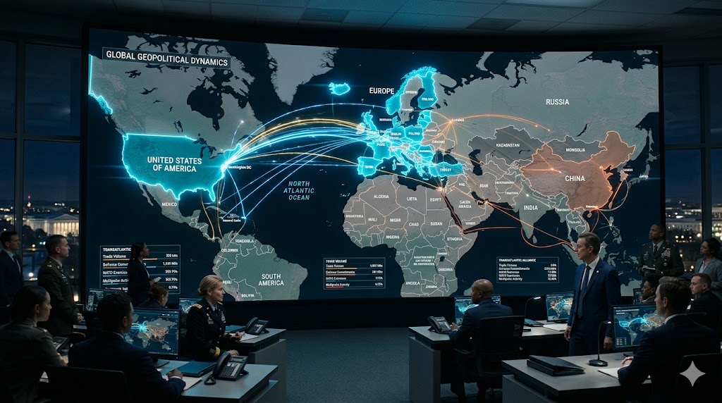 Mappa geopolitica con collegamenti strategici tra Stati Uniti ed Europa