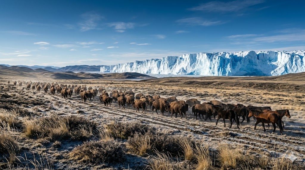 Mandrie in migrazione nella steppa dominata dall'imponente calotta glaciale dell'Inlandsis