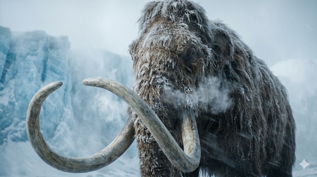 Il mammut lanoso (Mammuthus primigenius) era il re incontrastato della steppa glaciale eurasiatica, un colosso di quattro o cinque tonnellate di peso e fino a tre metri e mezzo di altezza al garrese, ricoperto da uno spesso manto di pelo lanoso color marrone-rossiccio che poteva raggiungere una lunghezza di quasi un metro sul dorso e sui fianchi. Sotto il pelo, uno strato di grasso sottocutaneo spesso fino a 10 centimetri forniva un ulteriore isolamento termico nei confronti del freddo glaciale, rendendo questo animale una delle macchine biologiche per la termoregolazione più efficienti mai evolutesi su questo pianeta. Le sue zanne ritorte verso l'alto, che potevano raggiungere lunghezze di 4 metri nei maschi anziani, erano strumenti multifunzionali usati per dissotterrare radici e vegetazione sotto la neve, per combattere con i rivali durante la stagione degli accoppiamenti e probabilmente come segnali di status sociale all'interno della struttura gerarchica del branco.