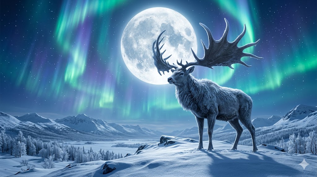 Cervo gigante illuminato dalla luna e dall'aurora boreale