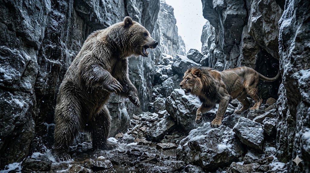 Epico duello tra un orso delle caverne e un leone delle caverne