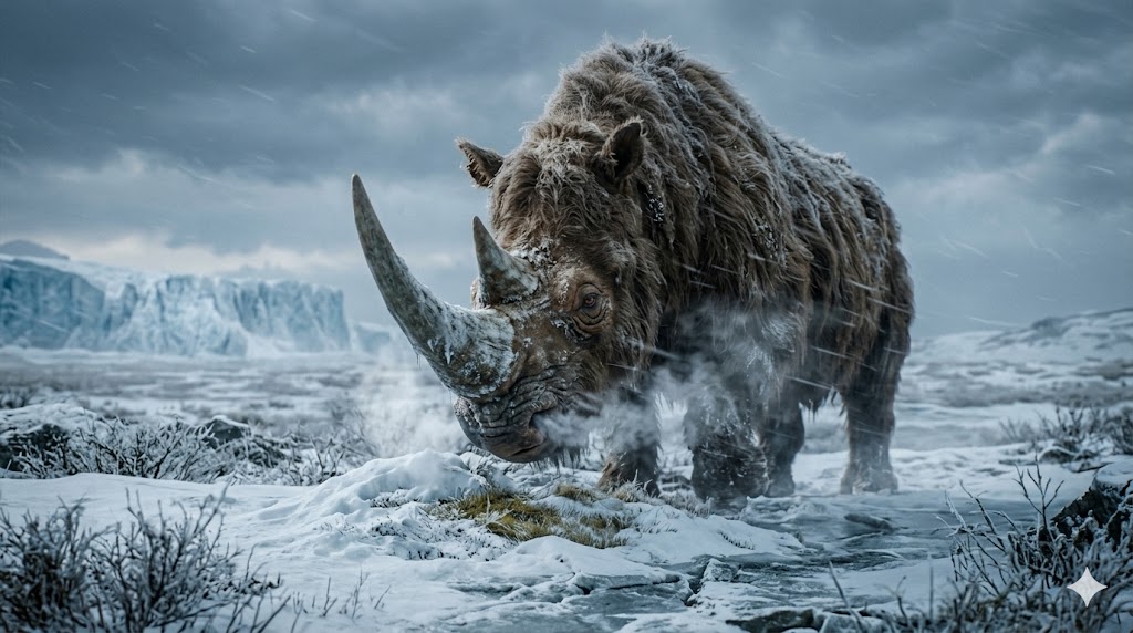 Massiccio rinoceronte lanoso avanza solitario attraverso la tundra ghiacciata